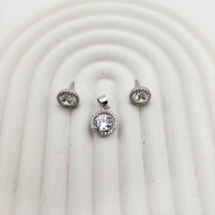 این ست ظریف و درخشان، ترکیبی از سادگی و ظرافت را در کنار جلوهای لوکس به نمایش میگذارد. طراحی دایرهای با نگین مرکزی درخشان، در کنار حلقهای از ریزنگینهای سفید، جلوهای چشمنواز و خاص ایجاد کرده است.