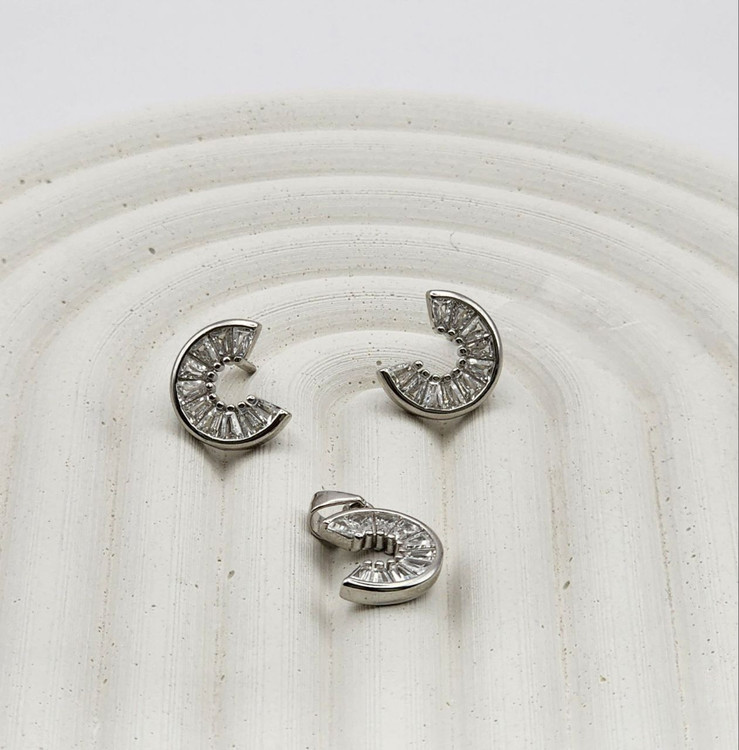 این ست ظریف و خاص با طراحی الهامگرفته از هلال ماه، جلوهای منحصربهفرد و مدرن به استایل شما میبخشد. ترکیب براق نقره با چینش دقیق نگینهای درخشان، حس ظرافت و درخشندگی را به زیباترین شکل ممکن منتقل میکند.