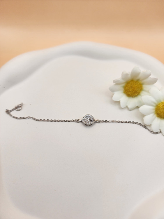 این دستبند ظریف و شیک از نقره عیار ۹۲۵ ساخته شده و دارای پلاک طرح قطرهای پوشیده از نگینهای درخشان زیرکونیا است که جلوهای لوکس و چشمنواز به آن بخشیده است. طراحی مینیمال و زنجیر ظریف این دستبند، آن را به گزینهای مناسب برای استفاده روزانه و همچنین استایلهای رسمی تبدیل کرده است.