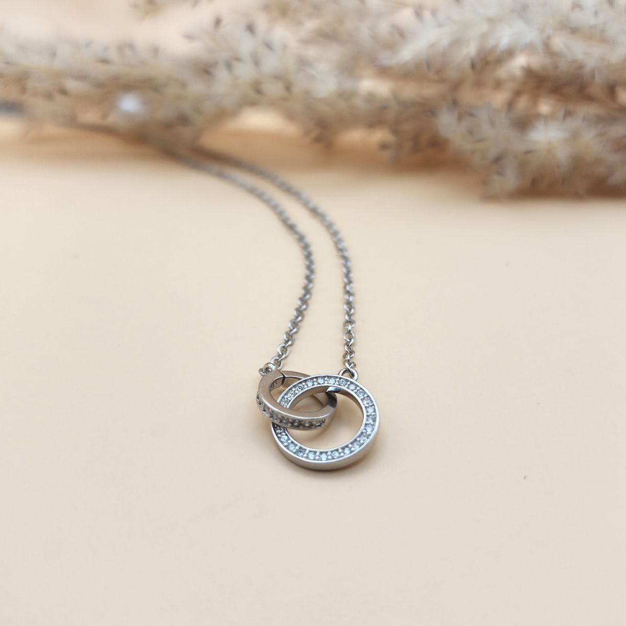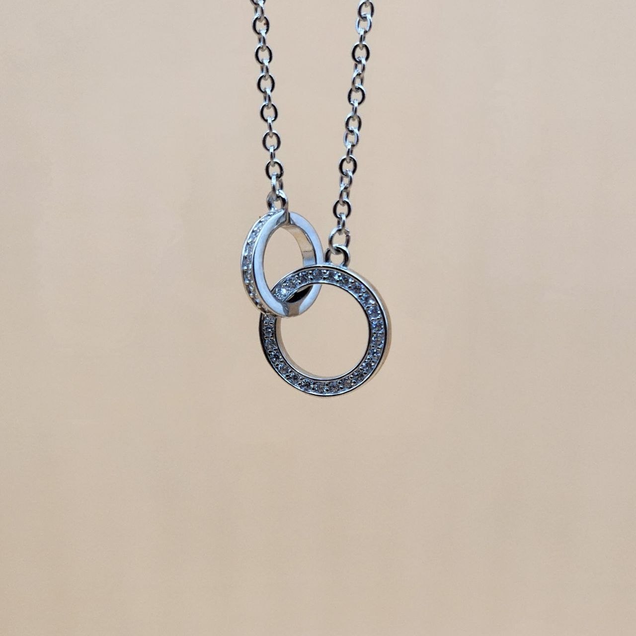 این آویز ظریف و درخشان از نقره با عیار بالا ساخته شده و با سنگهای زیرکونیا تزئین شده است که درخشش آن را دوچندان میکند. طراحی دو حلقهی درهم، نماد پیوند و ارتباطی عمیق است و جلوهای مدرن و در عین حال کلاسیک به استایل شما میدهد.